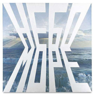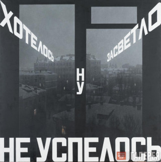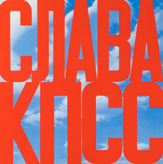 Солнце уБулатова всегда побеждает тьму («Явсю жизнь верю,что воснове всего— свет»),мечты освободе отменяют правду подневольной жизни («Ясразу ставил себе цель— быть свободным»),будущее одерживает верх над безнадежным прошлым,как еще в1970-х обещала одна изсамых узнаваемых картин Эрика Булатова «Слава КПСС». Жирные красные буквы,заполняющие квадрат окна,едва оставляют место для неба соблаками. Автор объясняет: